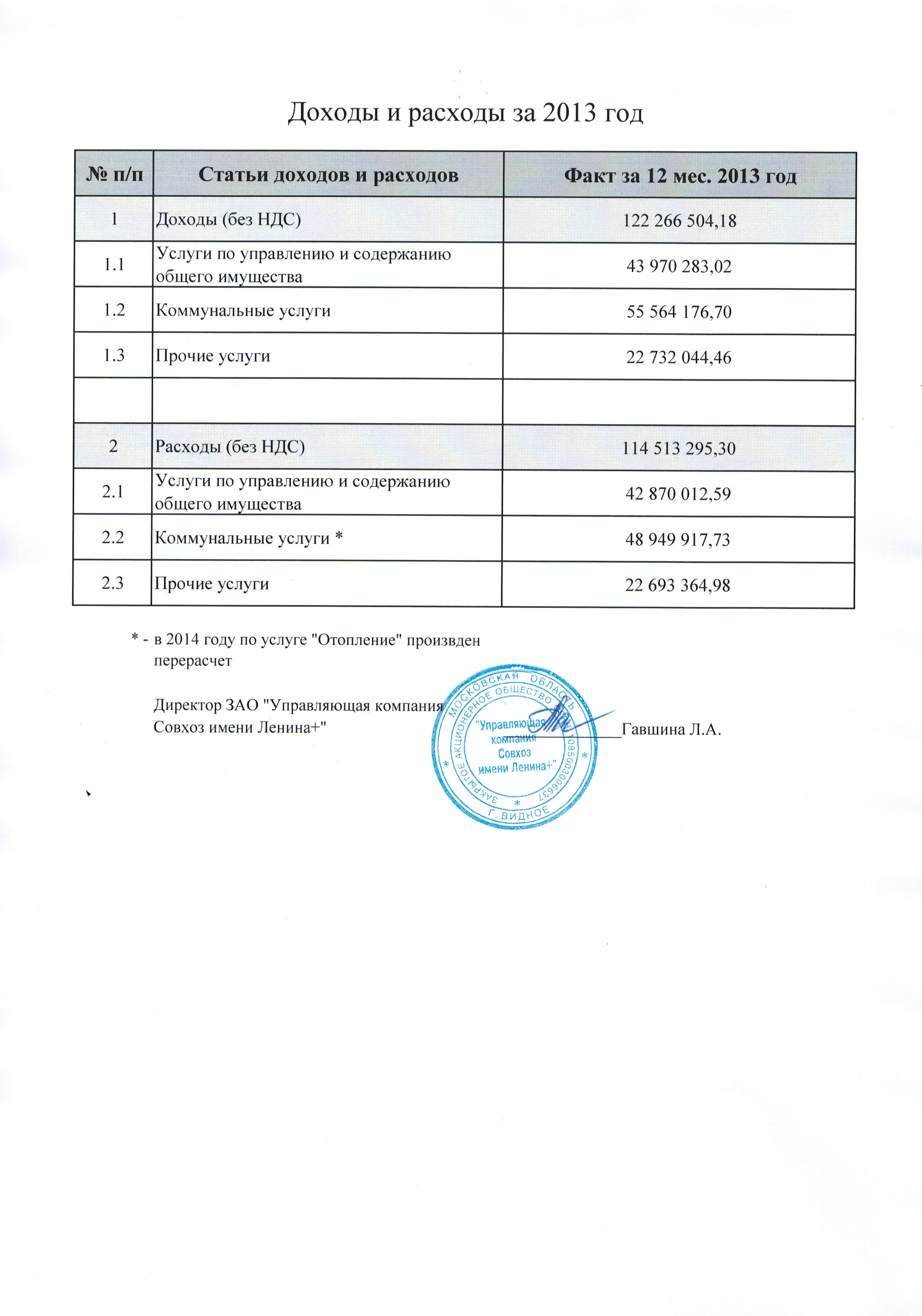 Доходы и расходы УК за 2013 год