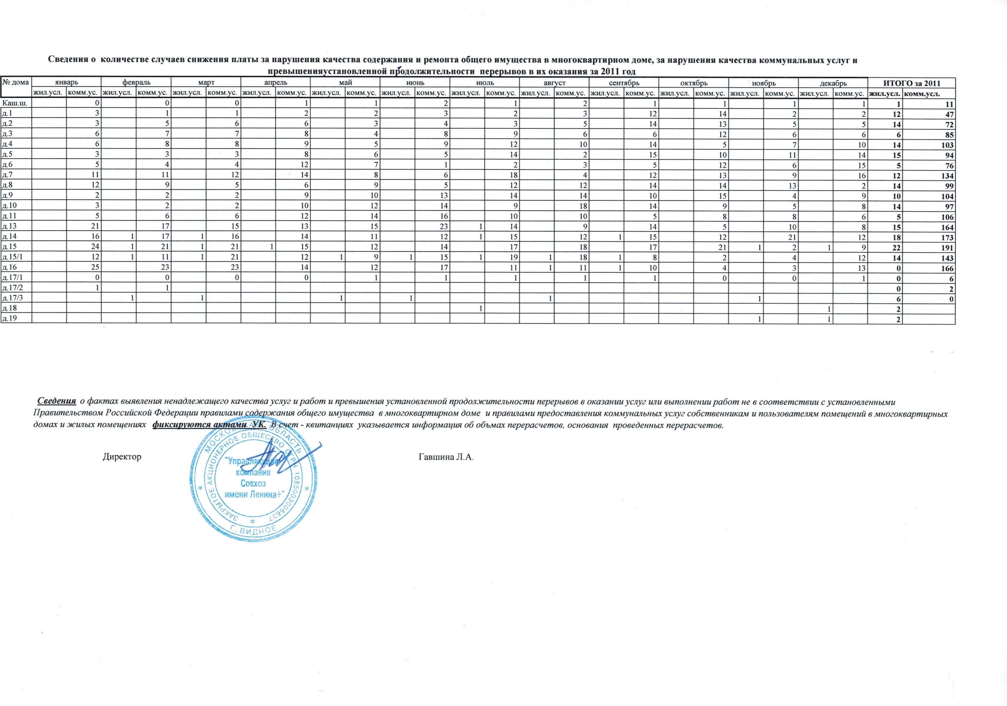 Сведения о случаях снижения платы за услуги за 2011 год
