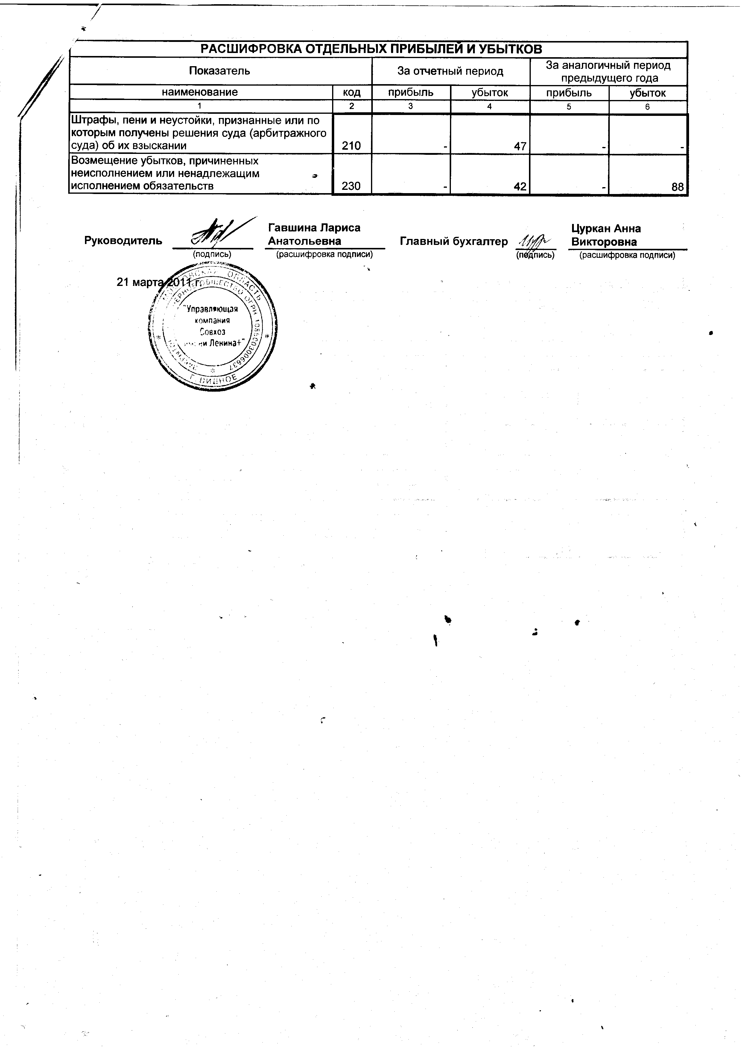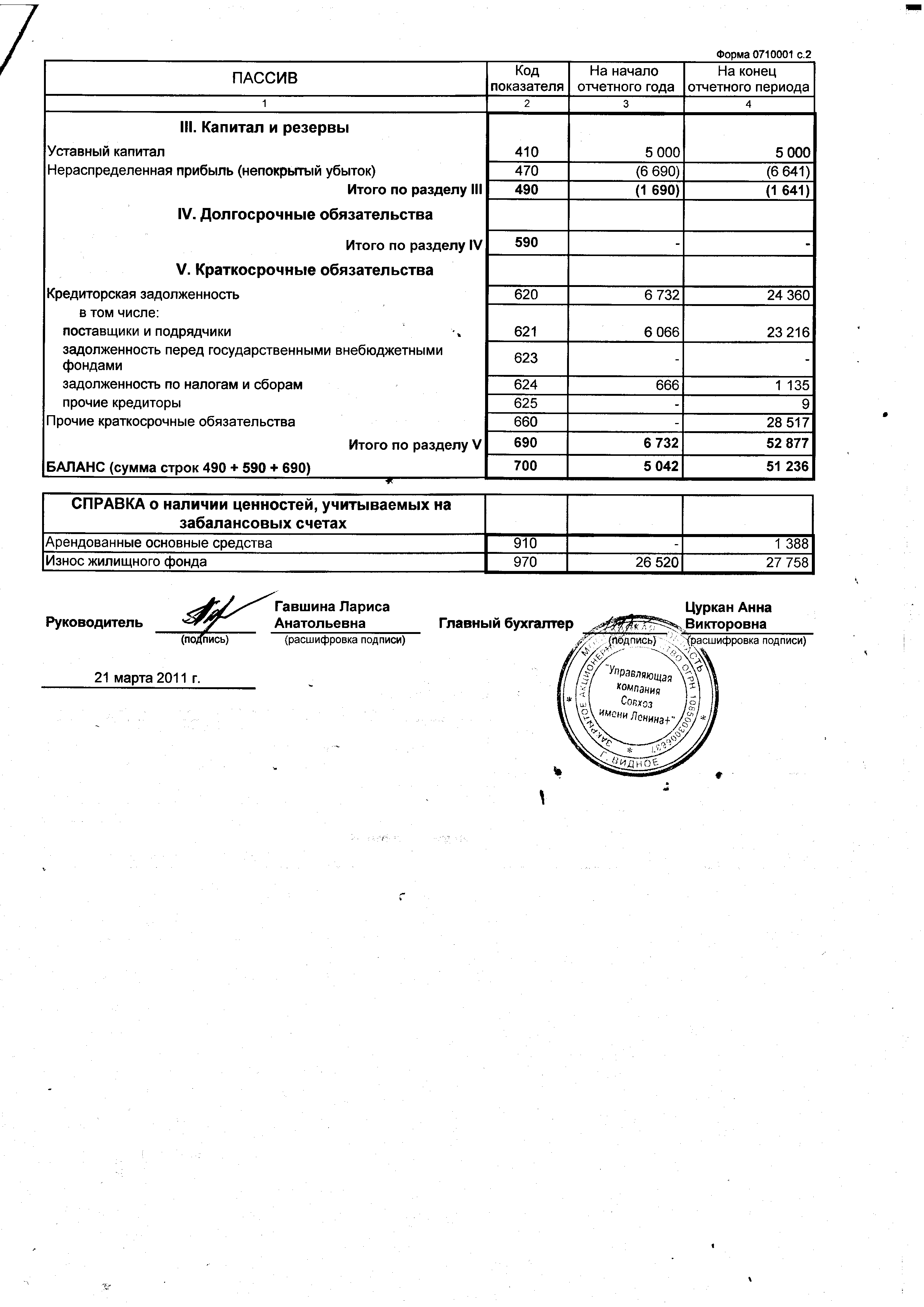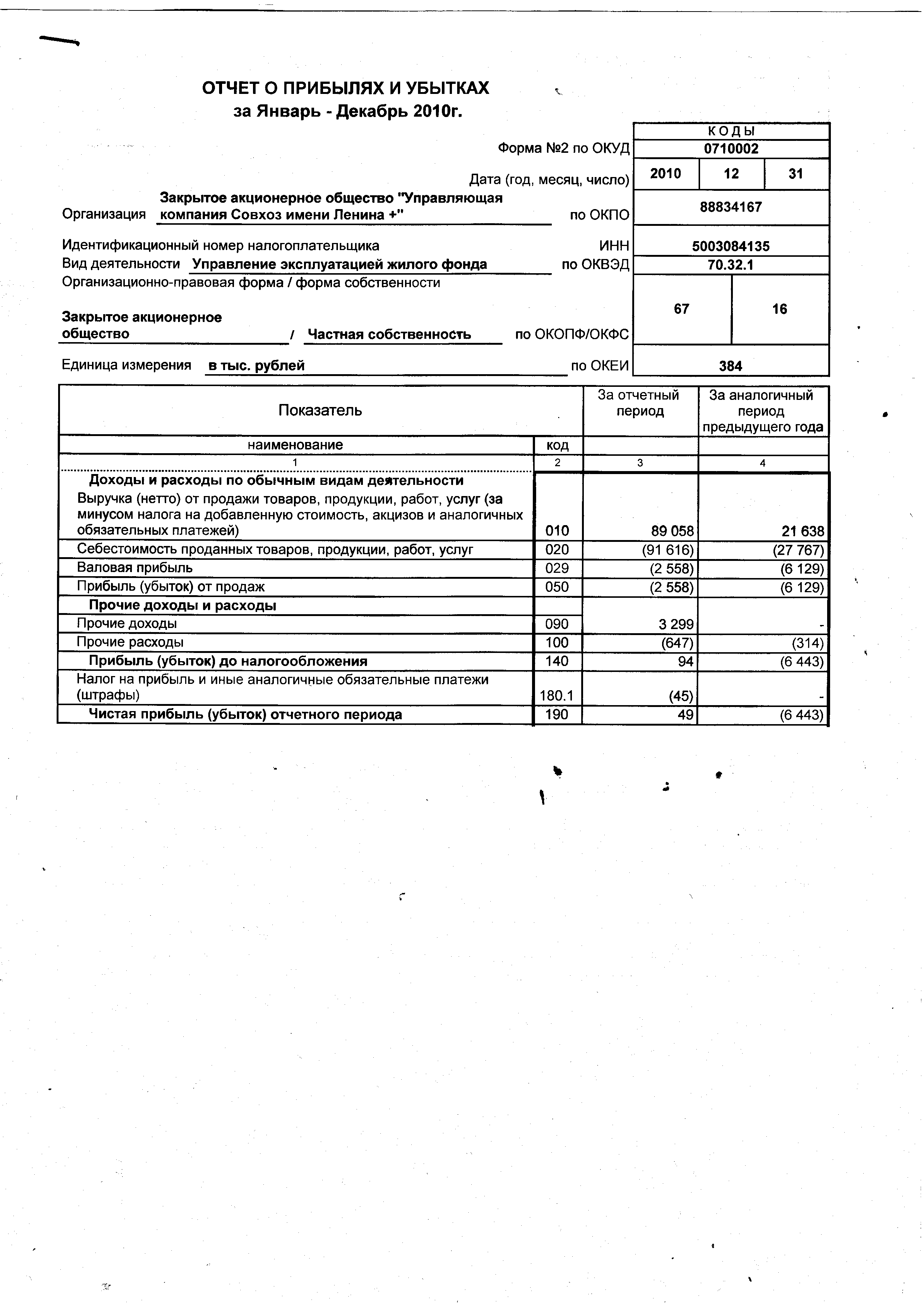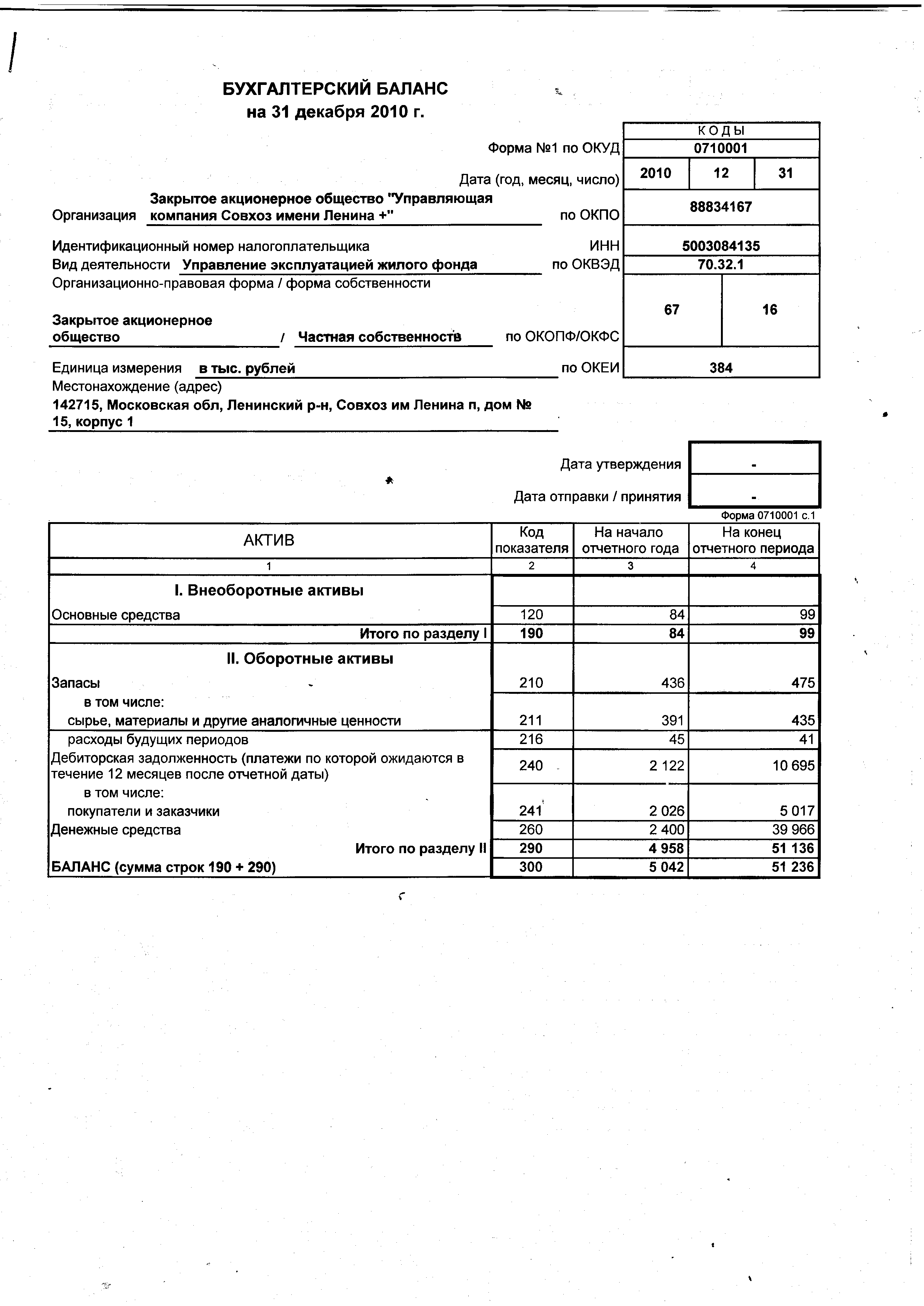 Бухгалтерский баланс ЗАО "Управляющая компания "Совхоз имени Ленина +" за 2010 год